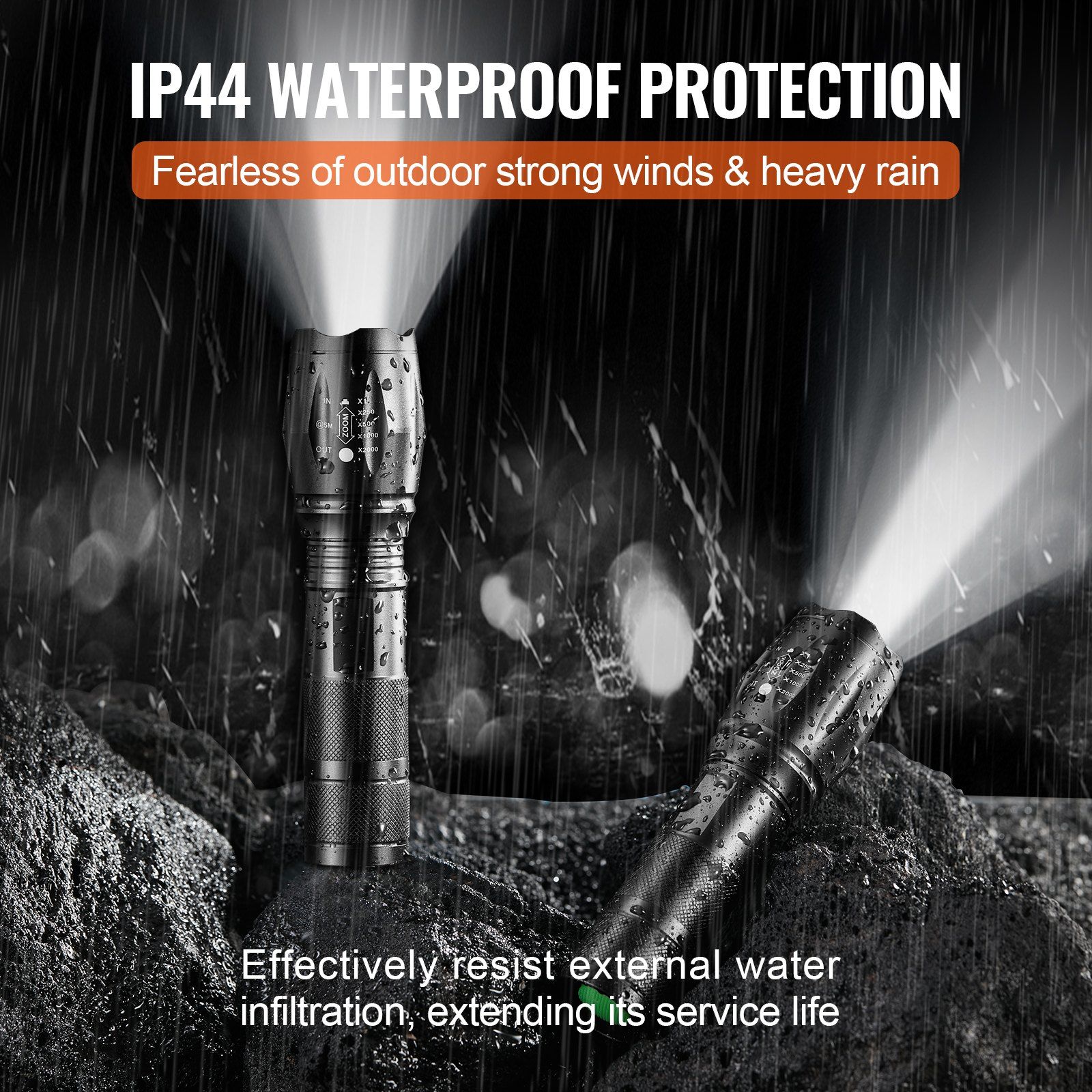 2000 lumens high brightness zoom flashlight: Adjustable focus, 5 lighting modes, IP44 waterproof rating, compact and portable, suitable for multiple scenes.