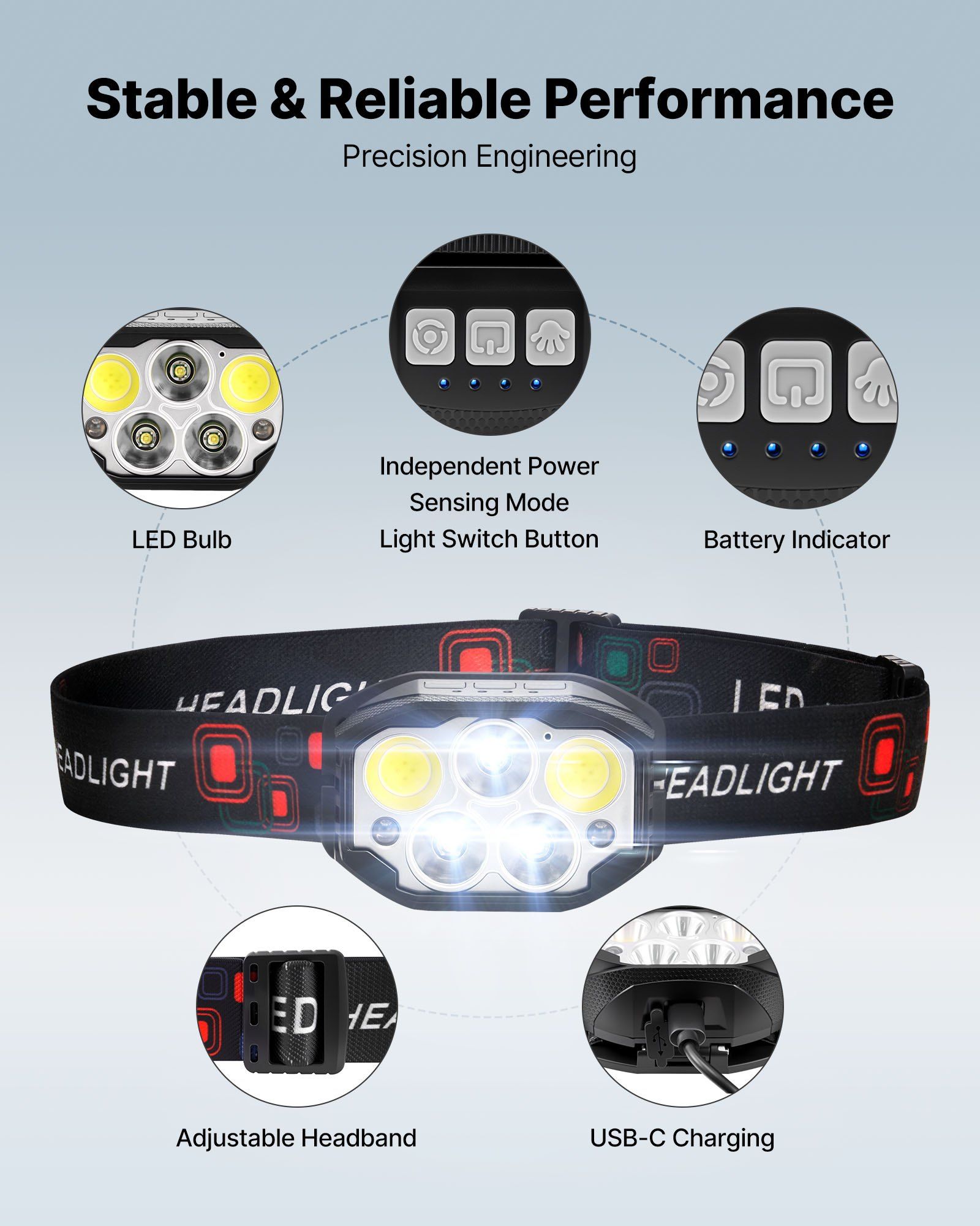 4.Smart Sensor Control: Integrated motion sensor technology allows you to turn the headlamp on/off or adjust brightness with a simple wave of your hand - no need to fumble with buttons in the dark.