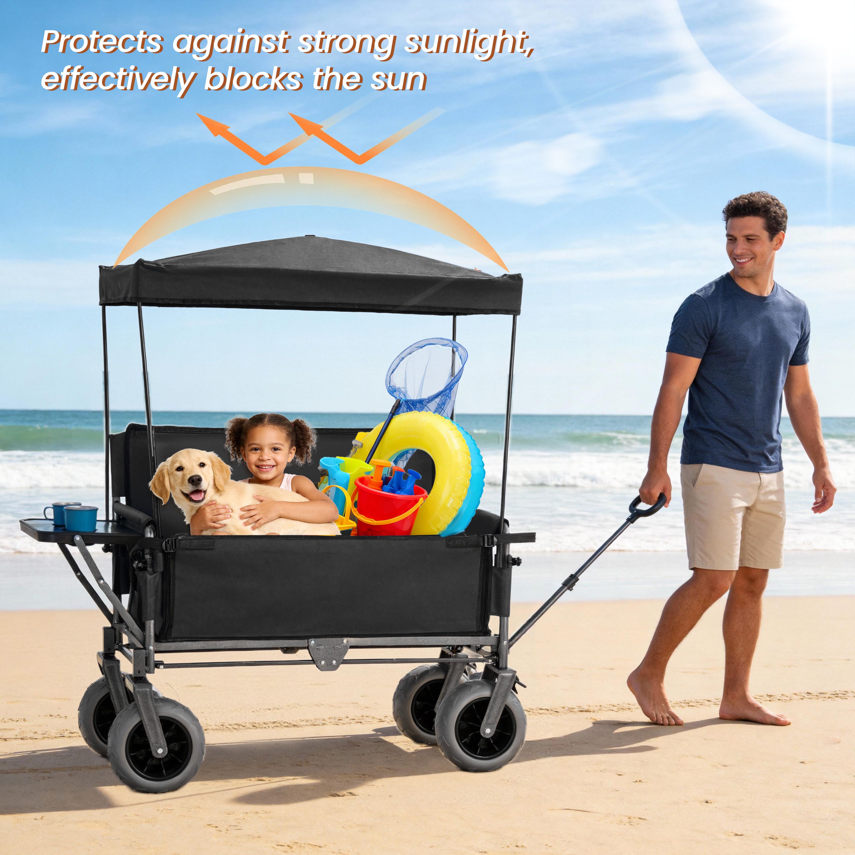 All-Terrain 360° Swivel Wheel System: 9"x4" Beach Tires, Tackle any terrain with confidence! Our folding wagon features dual front swivel wheels with 360°rotation and double bearings for extra load support and smooth mobility. Whether on beach, grass, or pavement, this all-terrain collapsible wagon is built for secure, stable, and easy transport.