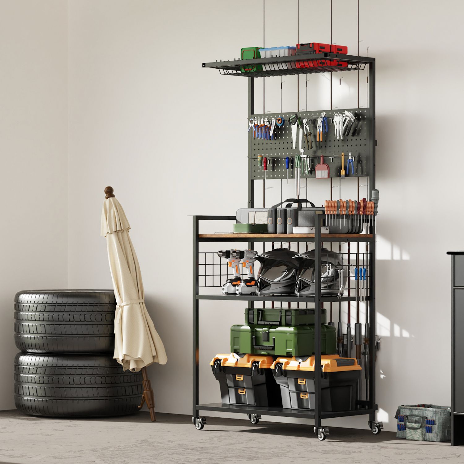 Smooth-Rolling Casters with Locking Wheels: Equipped with 360° swivel casters for easy movement. Two lockable wheels keep the rack stable when parked—perfect for garages, storage rooms, or workshops.