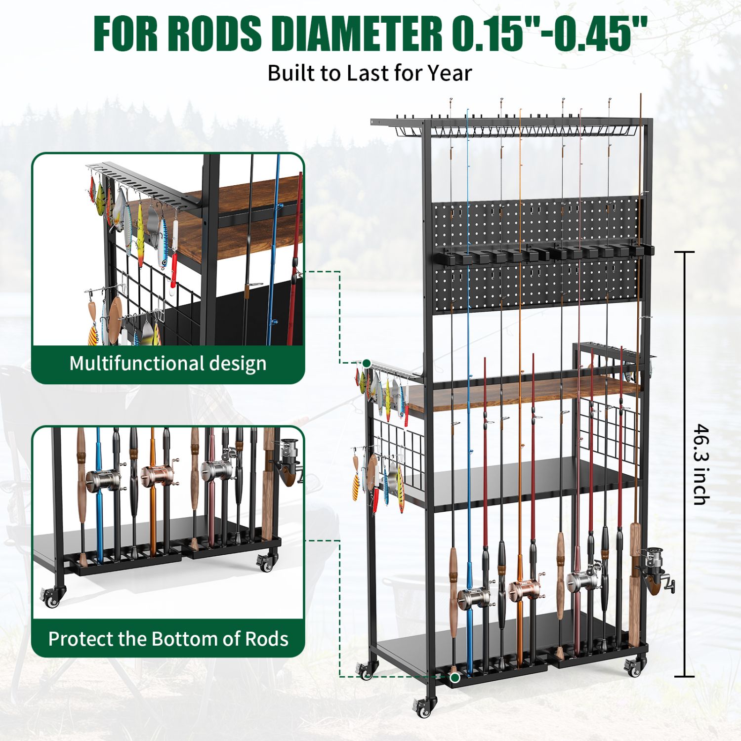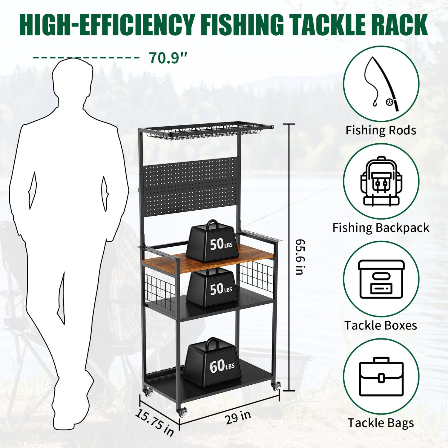 High-Efficiency Fishing Tackle Organization: Designed to organize all your fishing gear in one place. Stores fishing rods, reels, tackle boxes, backpacks, and accessories neatly, keeping your garage or fishing room clutter-free.