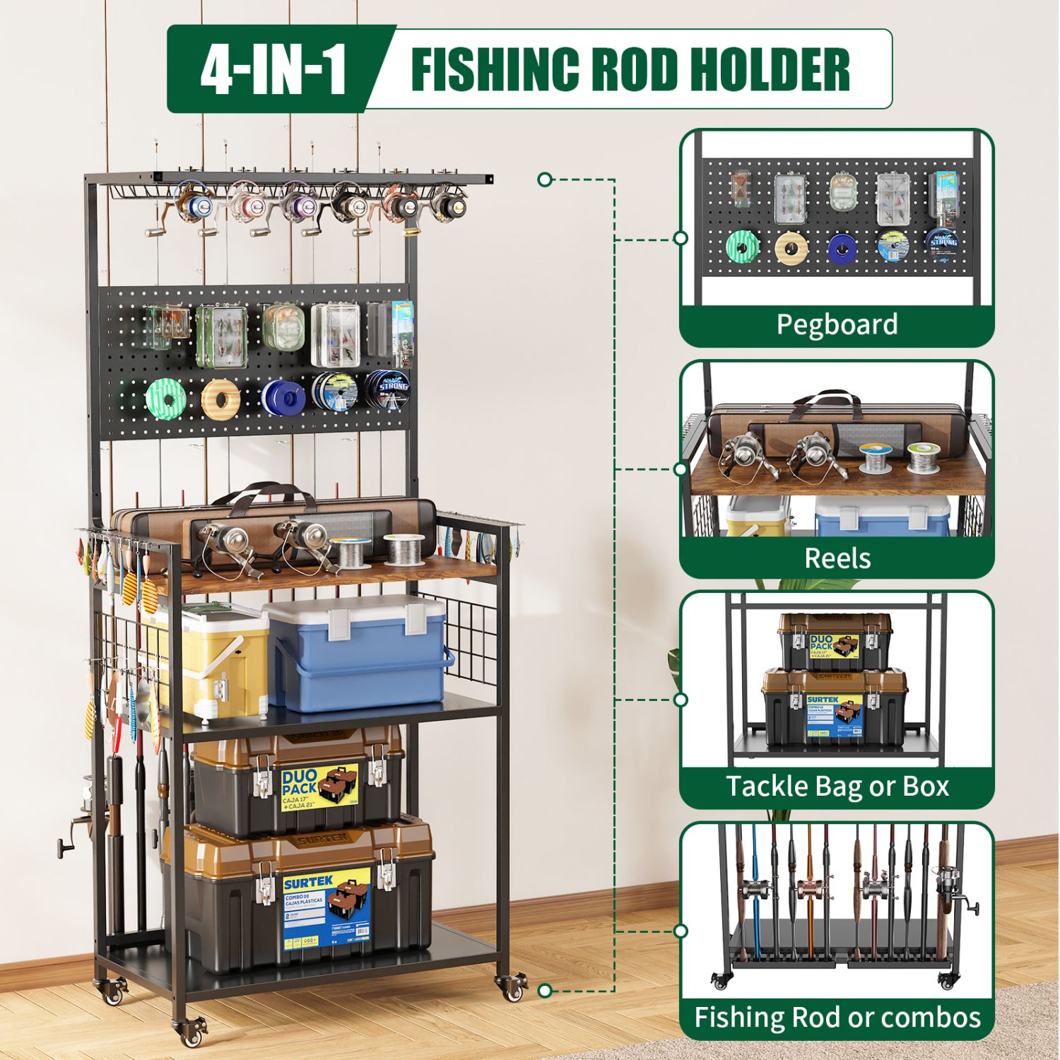 4-in-1 Storage System with Pegboard: Integrated pegboard, rod holders, reel storage rack, and multi-tier shelves provide versatile storage options. Easily customize hooks and layouts to fit your fishing setup.