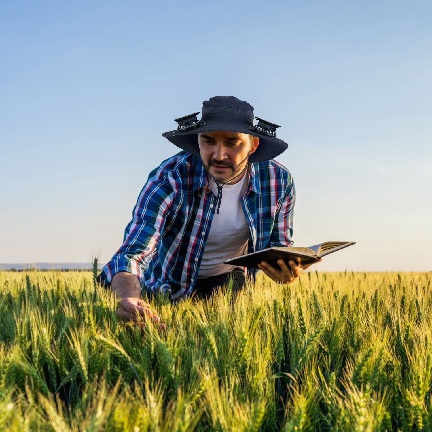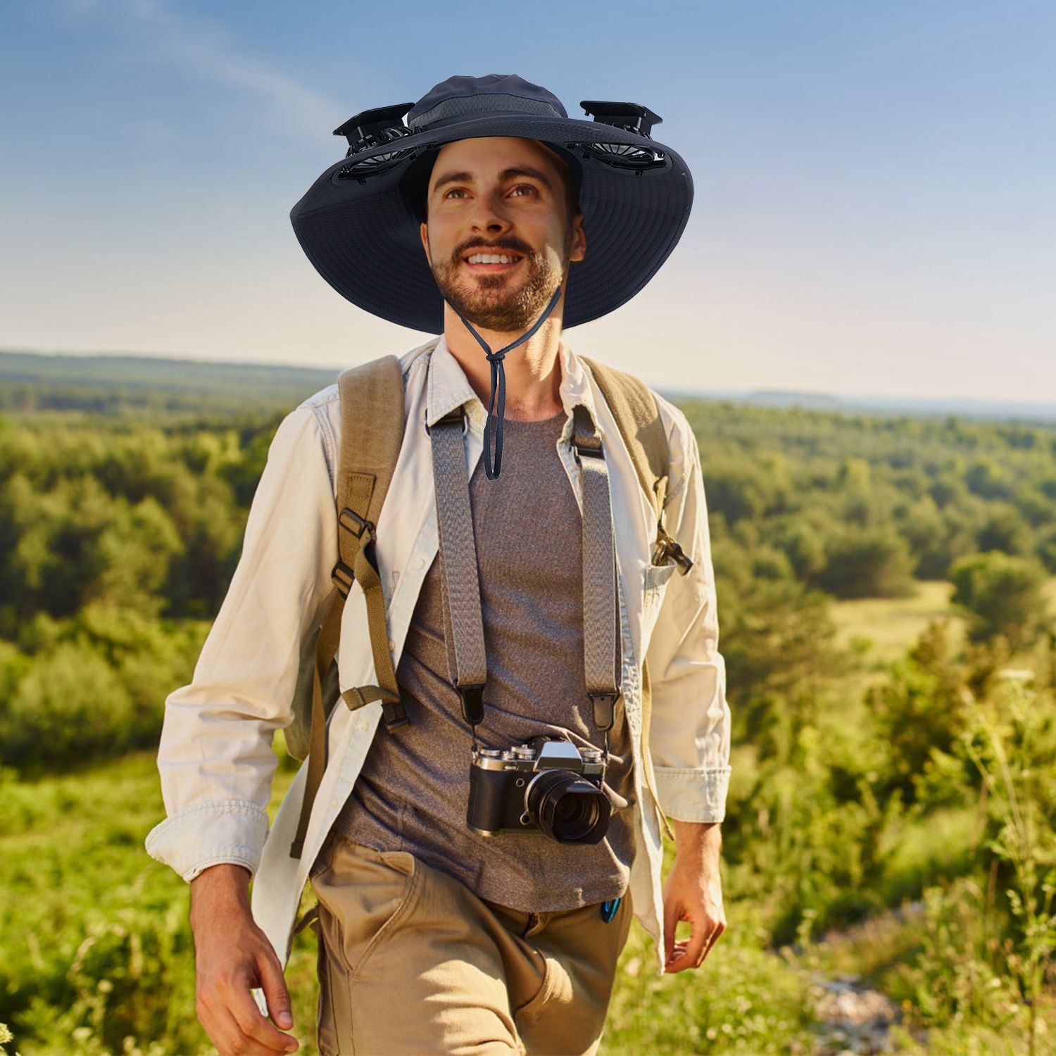 *Sun Hat With Fans*:Adopts 2 detachable fans with high-performance and quiet motor,this wide brim hat really does the job of bringing you endless coolness wherever you go and frees your hands from the handheld fan during outdoor. What’s more,3 wind speeds and 75° adjustable angle meets your personal demands.