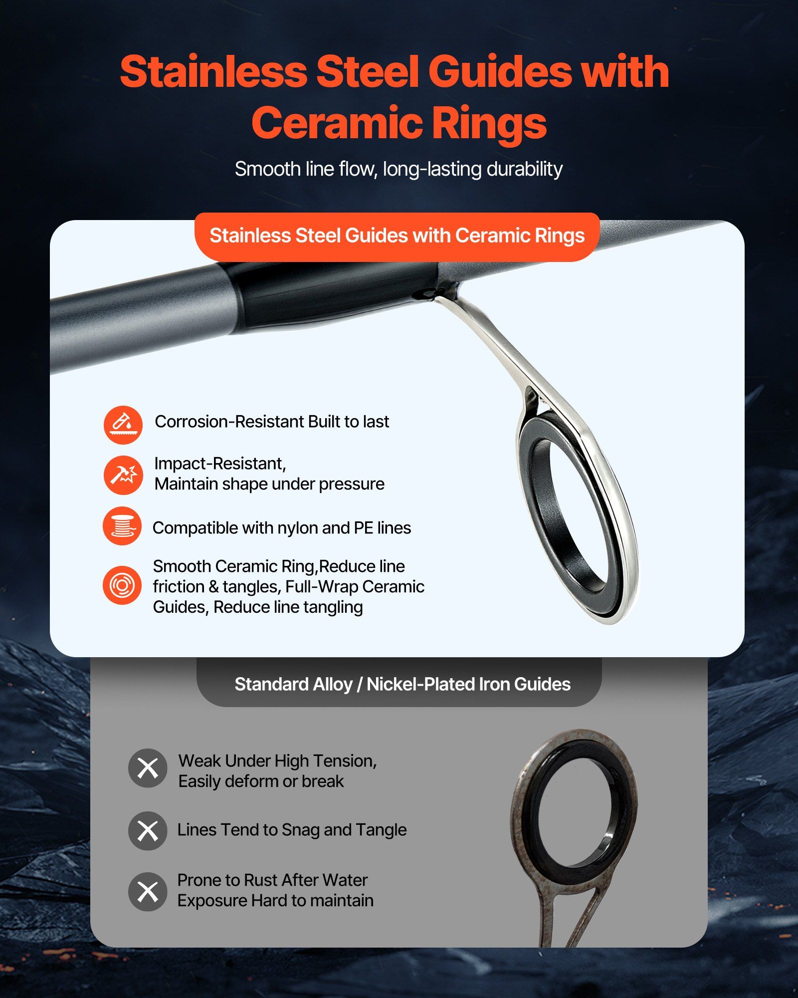 3.Ceramic Ring Guides: Featuring stainless steel guides with ceramic inserts, our bass fishing pole is built for durability and corrosion resistance, providing reliable performance in any environment. The smooth ceramic rings reduce friction and minimize line tangling, making it compatible with both nylon and PE lines for a seamless fishing experience